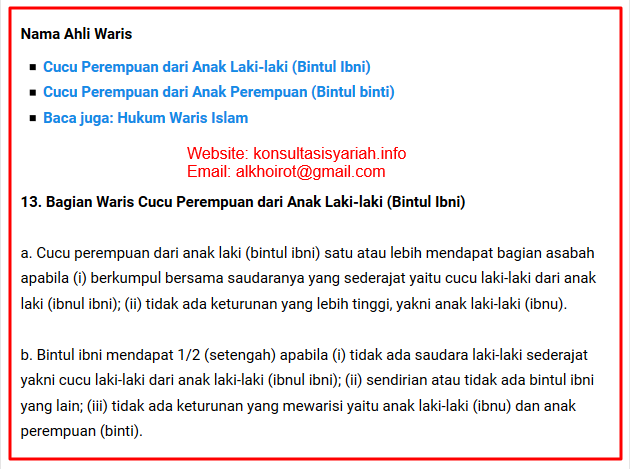 f. Cucu perempuan dari anak laki-laki (bintul ibni) mendapat 2/3 dan asobah sekaligus apabila hanya ada dua atau lebih bintul ibnu dalam arti tidak ada golongan ahli waris lain. Cara membaginya adalah dibagi rata.