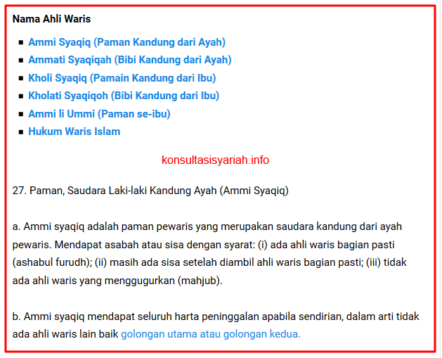 a. Ammi syaqiq adalah paman pewaris yang merupakan saudara kandung dari ayah pewaris. Mendapat asabah atau sisa dengan syarat: (i) ada ahli waris bagian pasti (ashabul furudh); (ii) masih ada sisa setelah diambil ahli waris bagian pasti; (iii) tidak ada ahli waris yang menggugurkan (mahjub).