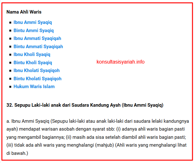a. Ibnu Ammi Syaqiq (Sepupu laki-laki atau anak laki-laki dari saudara lelaki kandungnya ayah) mendapat warisan asobah dengan syarat sbb: (i) adanya ahli waris bagian pasti yang mengambil bagiannya; (ii) masih ada sisa setelah diambil ahli waris bagian pasti; (iii) tidak ada ahli waris yang menghalangi (mahjub) (Ahli waris yang menghalangi lihat di bawah.)